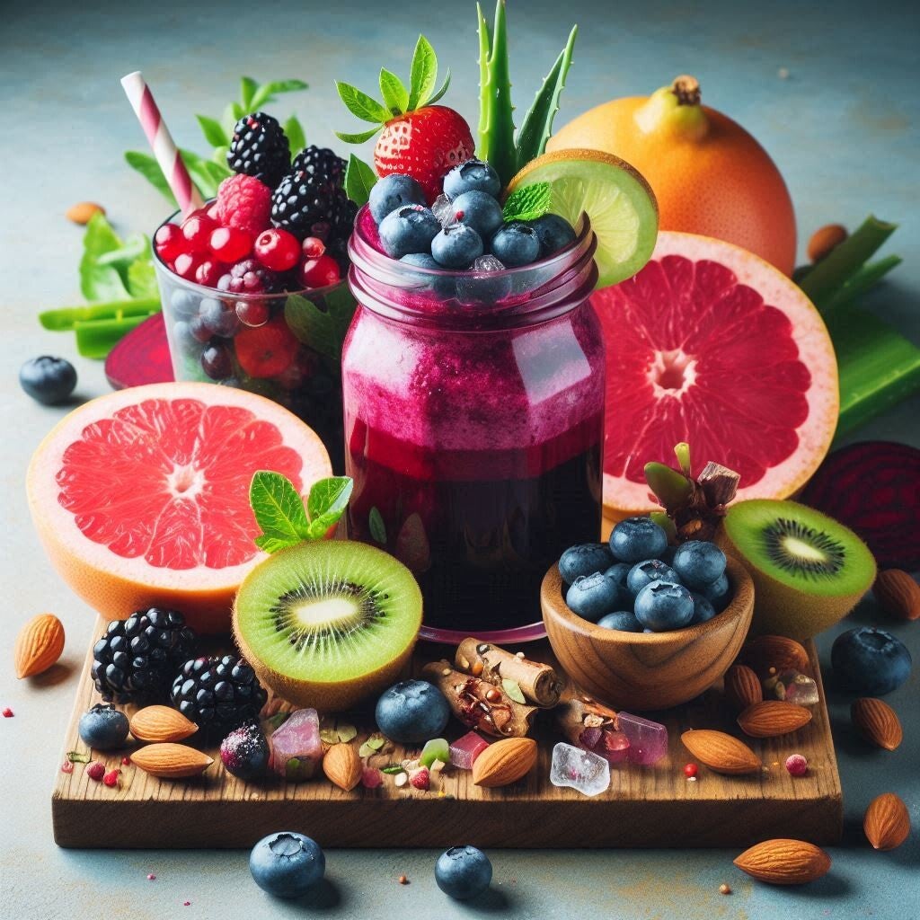 Blaubeeren, schwarzen und roten Beeren, Kiwi, Aloe Vera, Grapefruit, Rote Bete und geschälten Mandeln.