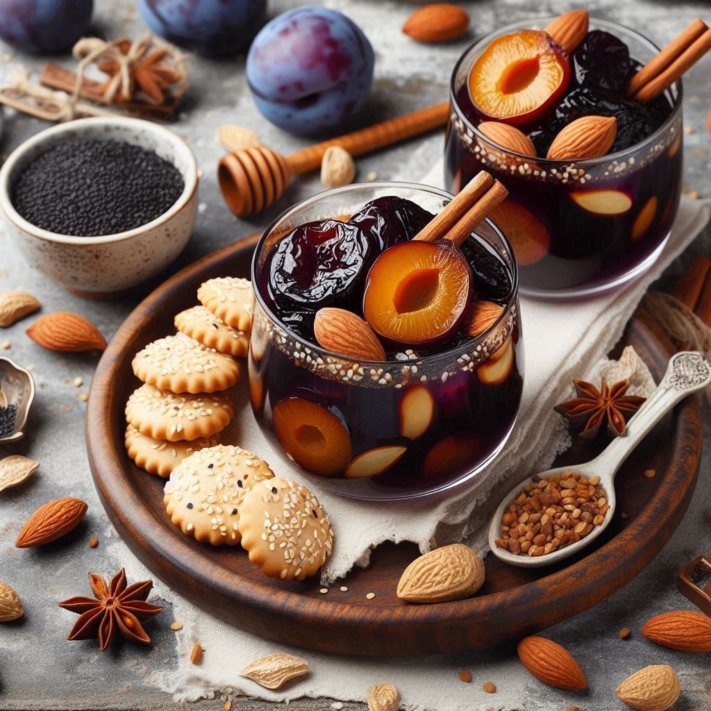 Pflaumenaufguss mit speziellen natürlichen Aromen nach dem Geheimrezept von Argana, serviert mit geschälten Mandeln und Gebäck mit Sesam, Anis und Schwarzkümmel.